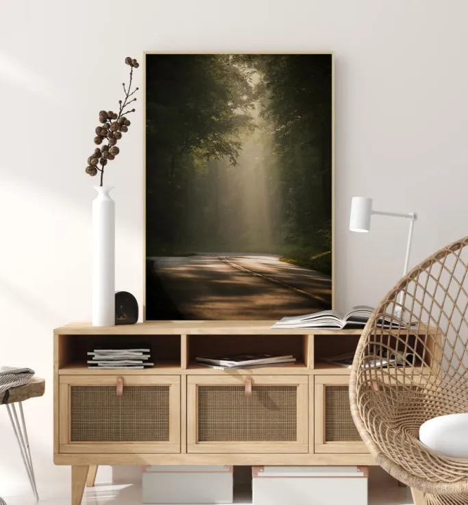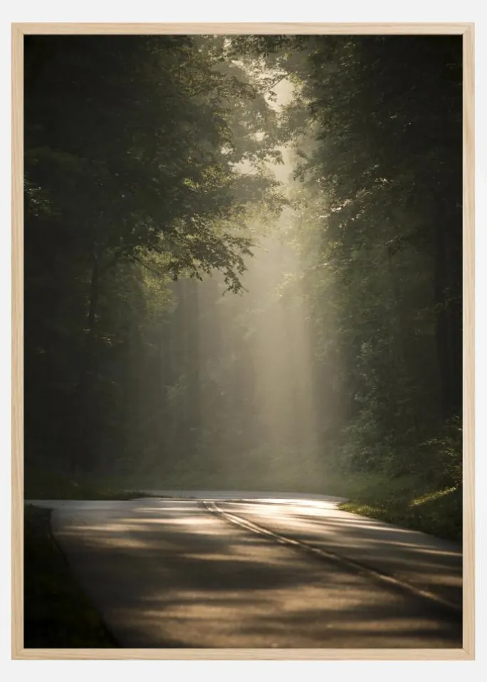 En fredfyldt plakat af en vej, der snor sig mellem høje grønne træer i et skovområde. En gylden lysstråle strømmer ned fra oven og skaber et plettet mønster på vejen. Følg vejen gennem denne skov for at få en virkelig fredfyldt rejse.