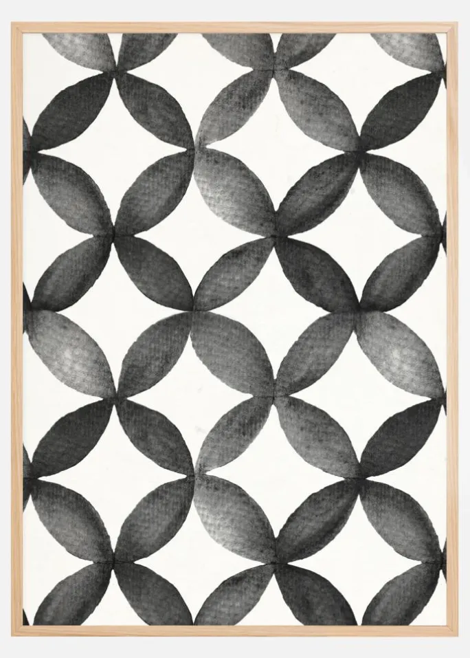 Denne plakat er en hyldest til den æstetiske kraft i geometriske mønstre. Det gennemgående motiv består af en serie sammenkoblede bladplanter i yndefulde sorte og hvide nuancer. De skaber et konstant flydende mønster, der både er fængslende og afslappende at betragte. Denne print forener traditionel naturinspiration med en moderne grafisk stil, hvilket gør den til en sofistikeret tilføjelse i ethvert hjem.