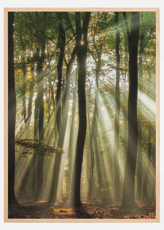 En skovplakat med solstråler, der falder mellem de høje træstammer. Lange stammer træer trækker øjet op gennem billedet. Øverst, som en stjerne, skinner solen gennem et hul og kaster bløde stråler gennem træerne og oplyser skovområdet i et blødt grønt skær. Forestil dig en tur i den stille skov.