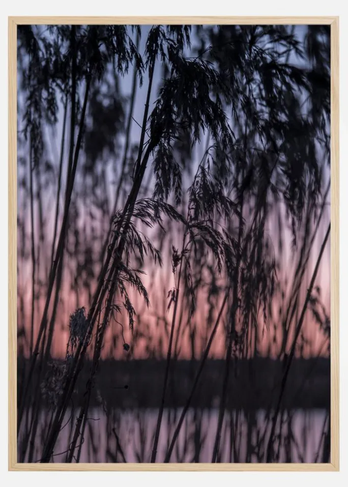 En blød, stemningsfuld plakat med siv ved solopgang. Kig gennem den lange sorte silhuet af stænglerne, mens de bløde græshoveder svajer over dem. Mellem planterne lyser den lilla og lyserøde himmel op, når solen står op tidligt om morgenen. Magi og skønhed er i overflod i dette betagende foto.