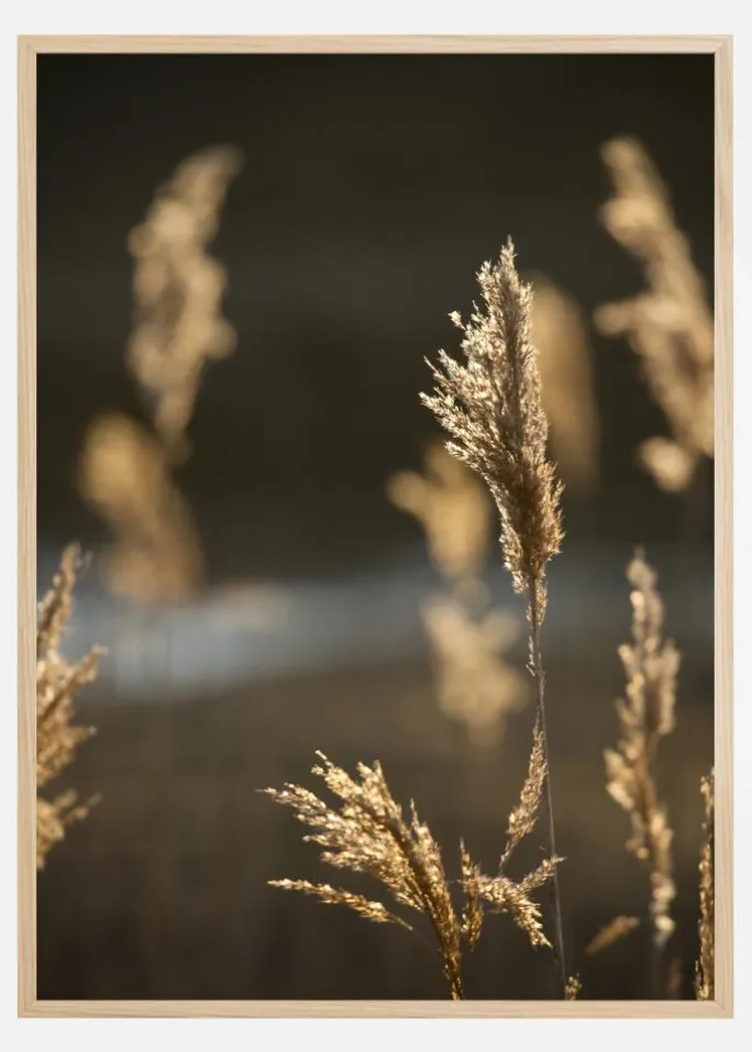 En sommerlig plakat med solskin på en mark. Nærbilleder af græskar svajer i en sommerbrise. De fanger solens gyldne lys, som også glimter fra den fjerne flod. Nyd dette stemningsfulde og bløde billede, der bringer sommeren hjem, når du hænger dette op.