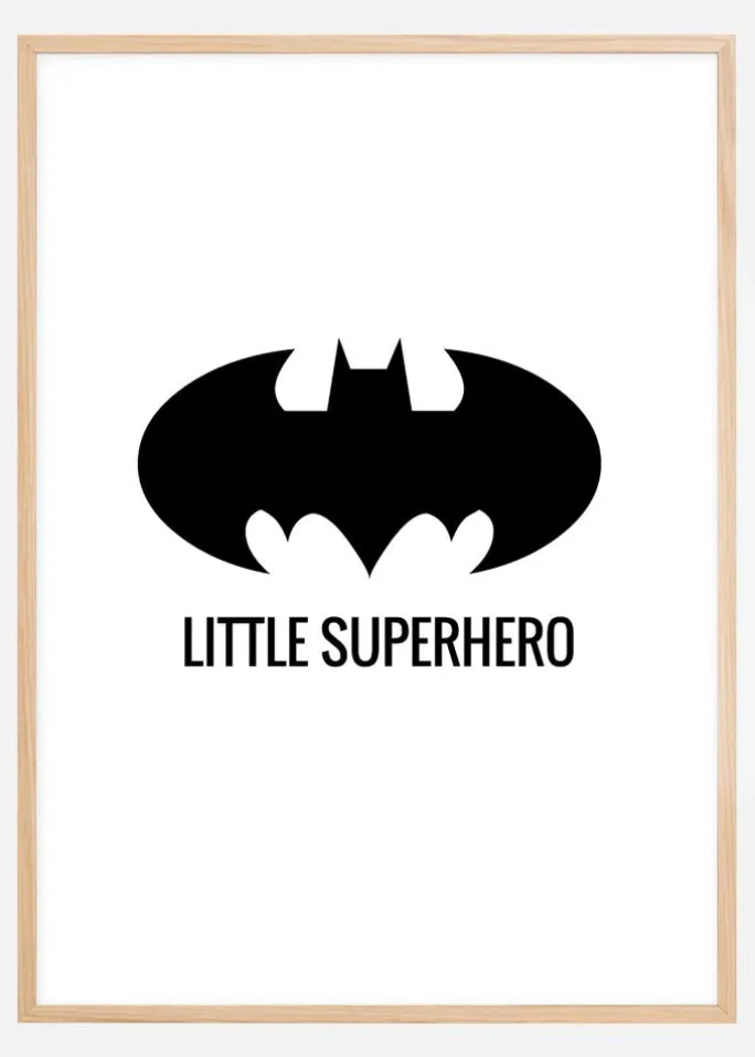 Nanananananananana Batman! Superheltplakater for alle små flagermus til at dekorere værelset med. Den grafisk sort-hvide illustration, med en stilren skrifttype, passer ind i alle indretningsstile men gør sig selvfølgelig bedst i fugtige grotter. Kombiner plakaten med et af de andre prints i samme stil for at skabe en serie – Dino Favorite, Elefant Dream, Hund Little, Superhero eller Kanin Happy.