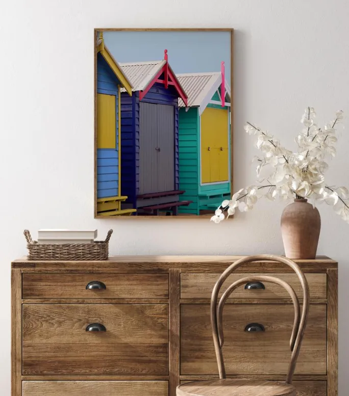 En lys plakat med farverige strandhytter. Hver af hytterne er malet i forskellige levende farver i gul, blå, pink og turkis. Få sommerens strandstemning, når du sætter den på en almindelig væg og giver farve til dit hjem.