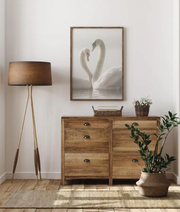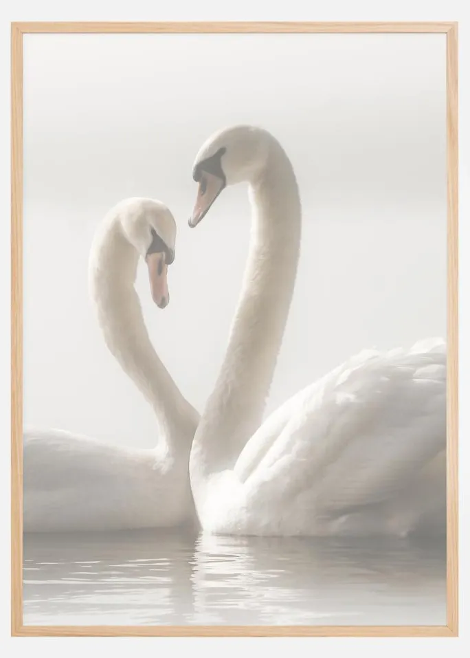 En romantisk plakat af to svaner, der svømmer sammen. Den bløde belysning giver en rolig sindsro til dette værk, mens svanerne glider hen mod hinanden. Deres halse rejser sig op for at skabe en hjerteform. Mærk kærligheden i dette dejlige billede.