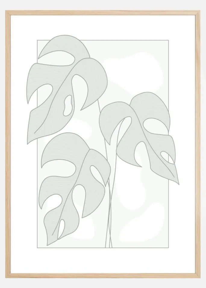 En enkel plakat med illustrative osteplanteblade. Tre store blade fylder billedet, hver i en blød grå tone. Blank tynde linjer udgør stilkene, mens disse elegante blade med huller i hænger ned i dette billede. Hold tingene underspillet ved at hænge på en blød grøn væg for at få en naturfornemmelse.