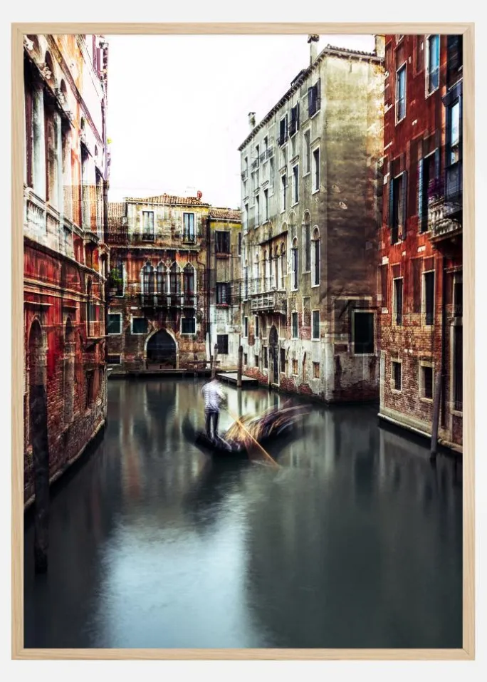 En levende plakat af en kanal og en gondol midt i Venedig. Kanalen er i bevægelse, og gondolen er ude af fokus, mens den bevæger sig gennem gaderne. Husene omkring kanalen er detaljerede og farverige i forskellige røde nuancer, som står i kontrast til det mere blå vand. Svøm væk med gondolen, mens du besøger denne smukke by.