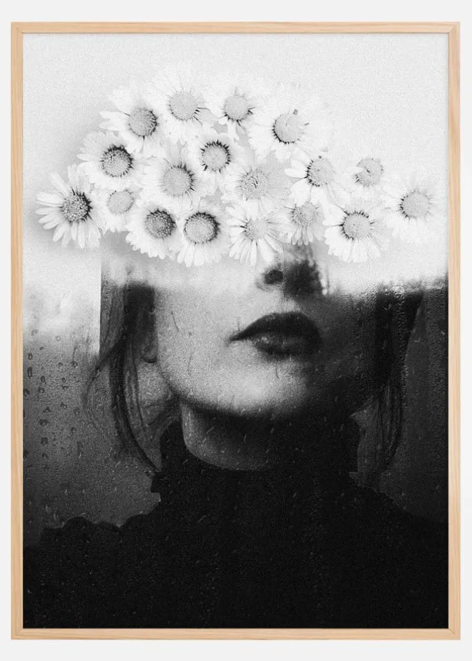 Denne kunstneriske og udtryksfulde plakat fremviser et kraftfuldt billede af en kvinde, hvis øjne er dækket af en krans af hvide margueritter, hvilket giver en stærk kontrast mod den sort-hvide fotografi. Den visuelle effekt af blomsterne over hendes øjne kan repræsentere en blanding af naturens skønhed med en dybere menneskelig følsomhed. Dette billede udfordrer beskueren til at se ud over det åbenlyse og udforske den indre verden, der er skjult bag den ydre skønhed.
