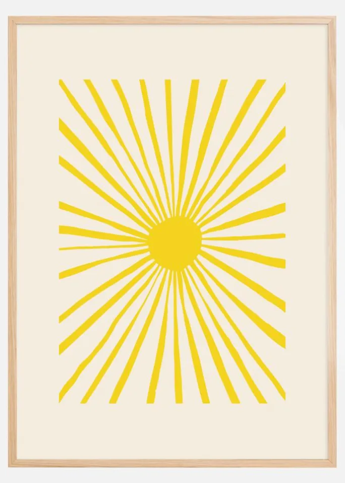 Giv din væg et strejf af solskin med denne livlige og energigivende plakat, der fanger essensen af en strålende sol. Dette minimalistiske design er kendetegnet ved dets stærke og strålende gule nuancer, der stråler ud fra et centralt punkt, og skaber en dynamisk effekt af solstråler, der breder sig over en beroligende cremefarvet baggrund. Denne solplakat giver en følelse af varme og glæde og bliver en øjeblikkelig blikfang i ethvert rum.
