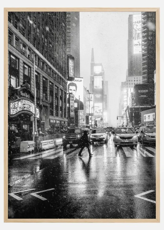 En urban plakat af Times Square i New York. En person krydser gaden om natten i regnvejr på dette sort-hvide billede. Bilerne venter alle på at komme videre. Lyse billboards og skyskrabere er synlige i det fjerne, mens du stirrer ned ad gaden. Atmosfæren er håndgribelig, man kunne næsten selv være der.