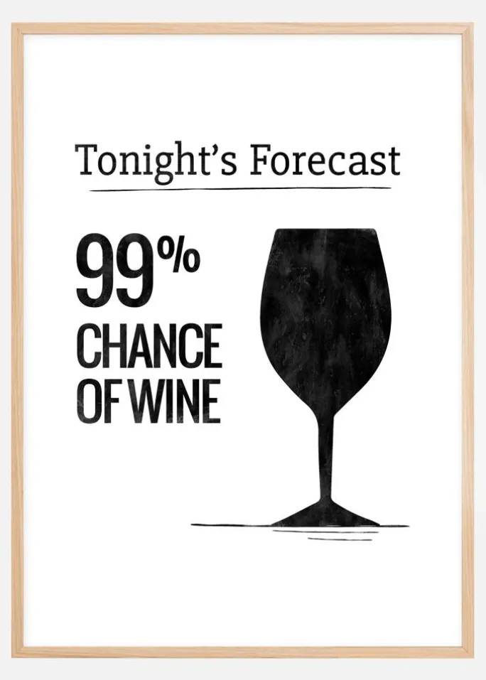 Efter en lang uge med arbejde og stress er det vigtigt, at du slapper af og dedikerer dig til noget, du virkelig holder af. Som at drikke vin for eksempel! Denne skønne plakat har en hvid baggrund og et sort posters i form af et vinglas sammen med teksten ”Tonights Forecast 99% Chance of Wine”. Det sort-hvide design fungerer rigtig godt sammen med en sort eller farverig ramme fra vores store udvalg. Da plakaten findes i 6 forskellige formater, kan du være sikker på at finde en størrelse, der passer lige til dig.