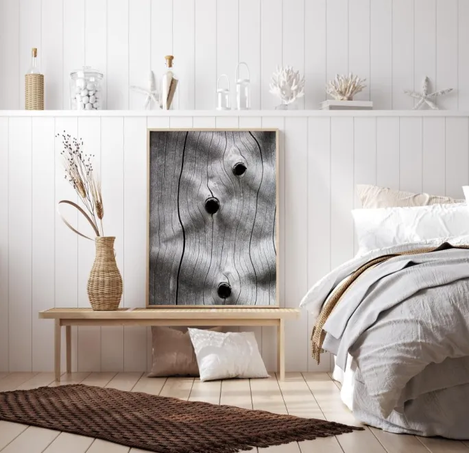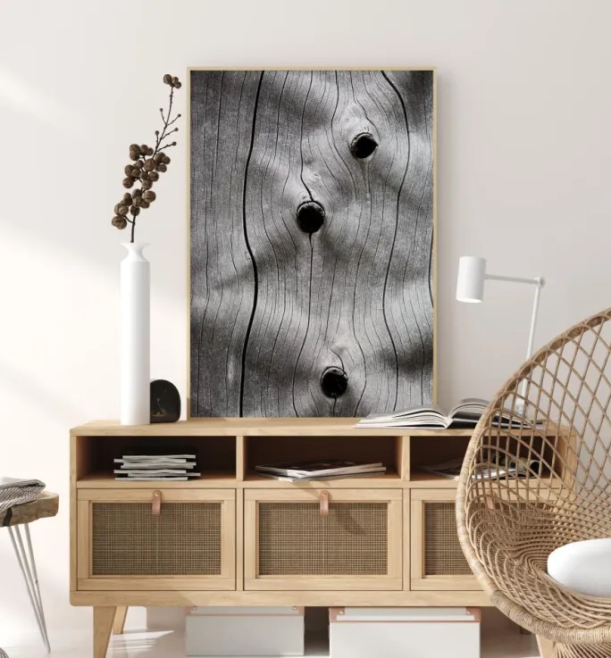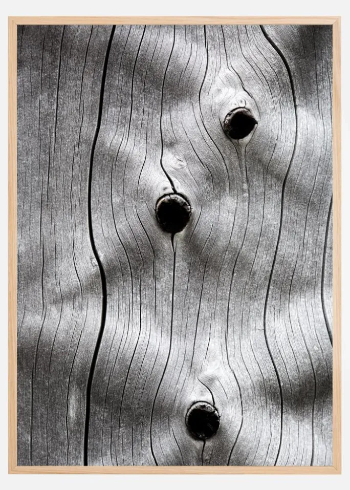 En makroplakat af en træstamme med tre huller i den. Træets korn er tydeligt, mens lastbilens linjer væver sig opad. Tre mørke huller åbner sig forskellige steder langs disse linjer, hvilket giver stammen en følelse af tekstur. Tilføj til en grøn væg for at få en mere naturlig stemning.