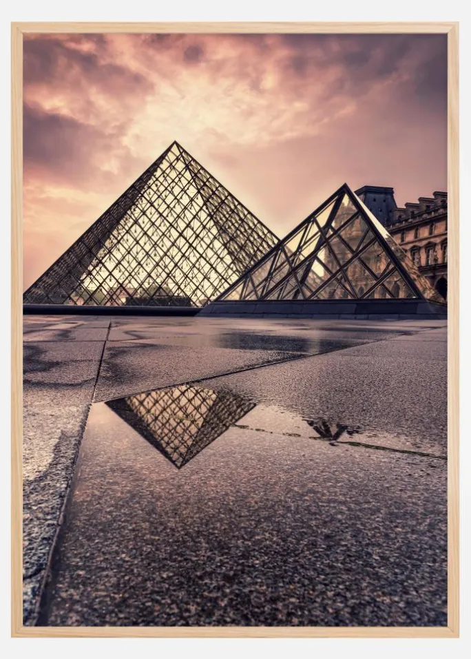 Denne moderne plakat afbilder de ikoniske geometriske former af en berømt struktur, som spejles i en vandpyt. De metalskinnende trekanter og glaspanelerne fanges i et dristigt perspektiv, med en himmel malet i bløde nuancer af lilla og rosa som skumringens sidste lys. Farvepaletten strækker sig fra kolde grå og sølvtoner til varme kobbertoner, hvilket reflekterer både konstruktionens holdbarhed og himmelens flygtige skønhed.