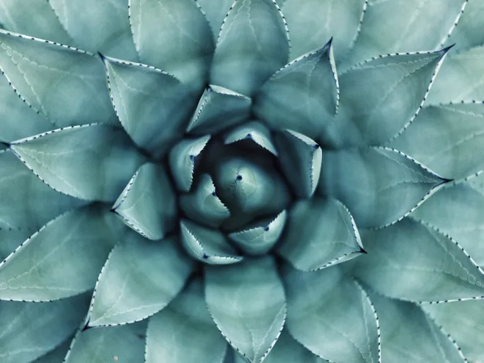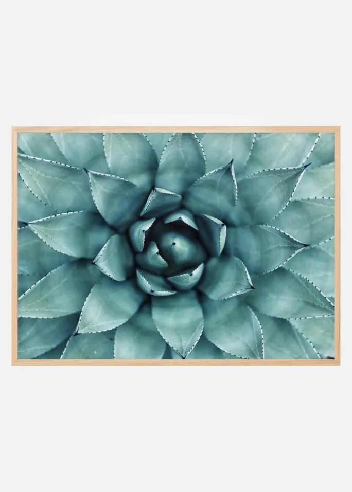 Grafisk plakat med et smukt nærbillede af en grønblå kaktus. Bladenes klare form med de mørke torne og den dæmpede turkise farve skaber et tiltalende mønster, der passer godt ind i alle typer af indretninger. Med en mørk billedramme som indramning gør fotografiet sig godt på væggen alene, men det kan også bruges som en del af et billedecollage med planter.