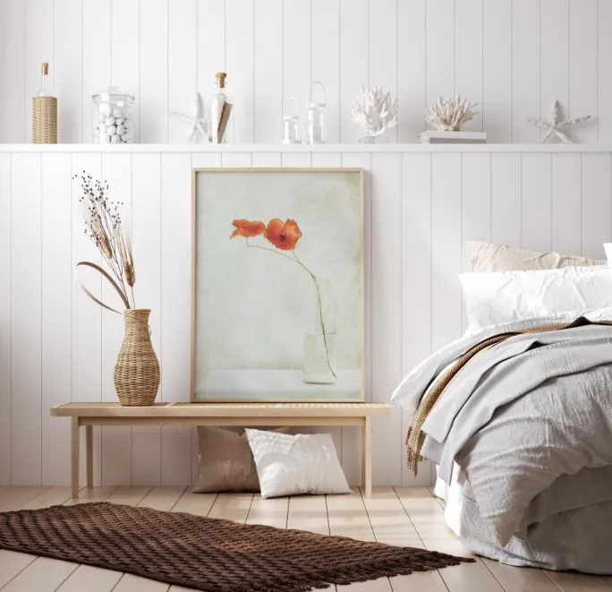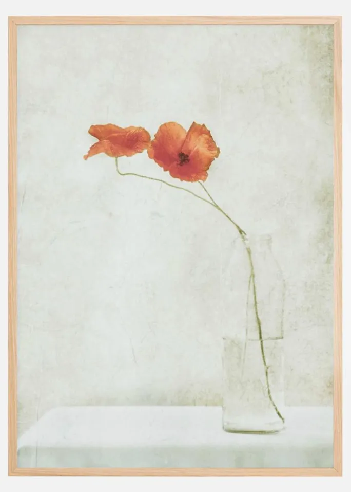En stillebenplakat af to røde valmuer i en klar glasflaske. Flasken forsvinder i baggrunden på den hvide væg. De to knaldrøde valmuer er fint malet og trækker øjet til sig, da de er det eneste farvesprøjt i denne enkle, smagfulde plakat.