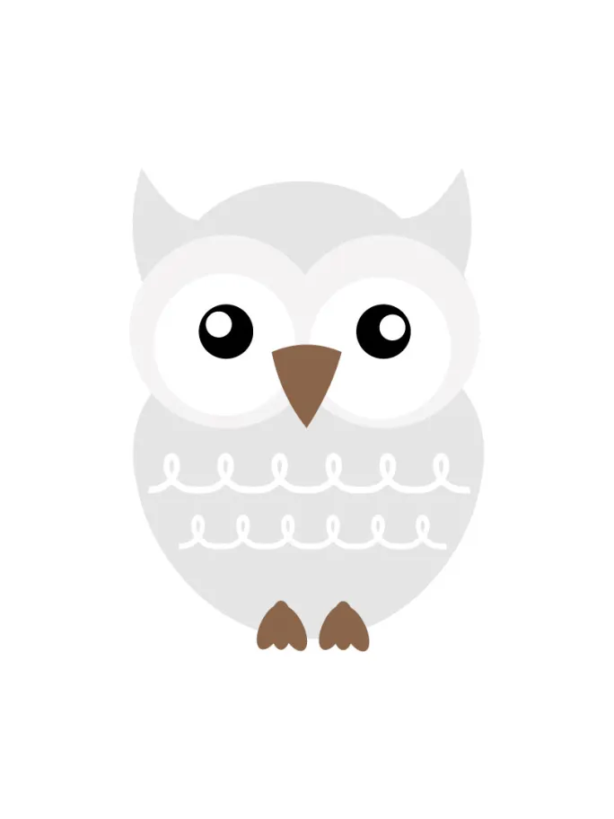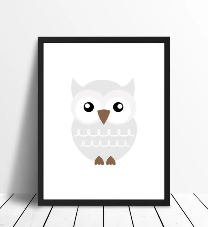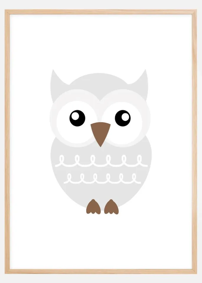 Sød plakat med indendørsfugl nummer ét, uglen. Illustrationen af en stiliseret dimgrå ugle mod hvid baggrund er blevet en moderne klassiker. Motivet passer lige så godt ind i stuen som i børneværelset og gør sig ekstra godt med en indretning, der tager farven op fra billedet. Kombiner med andre fugle eller dyr for en vild følelse.
