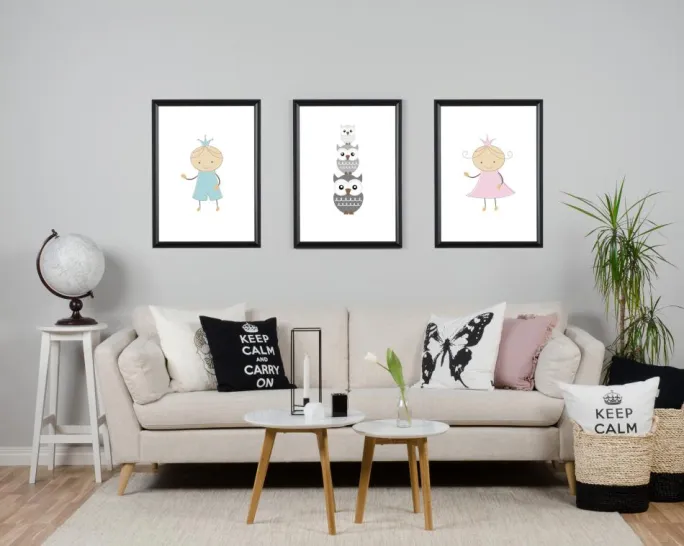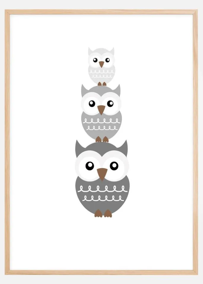 Tre er bedre end en. Billedkunst med indendørs pippin nummer et, uglen. Illustrationen af tre stiliserede dimgrå ugler stablet oven på hinanden mod hvid baggrund er blevet en moderne klassiker. Motivet passer lige så godt ind i stuen som i børneværelset og gør sig ekstra godt med en indretning, der tager farven op fra billedet. Kombiner med andre fugle eller dyr for en vild følelse.