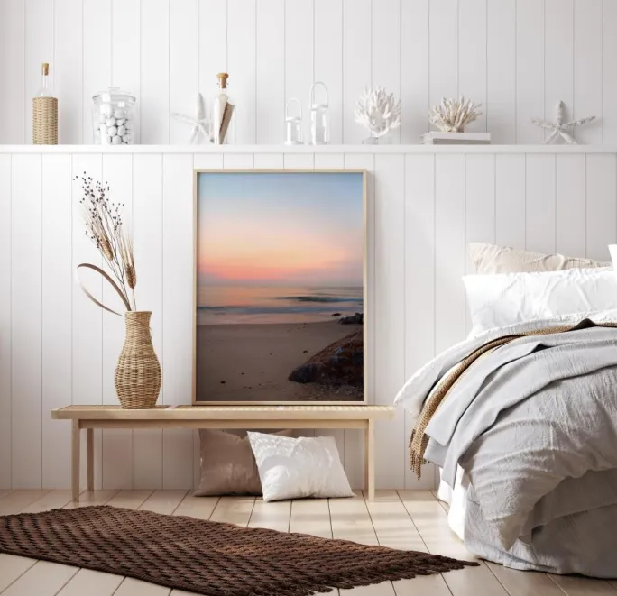 En strandplakat med en bred sandflade med det rolige hav i baggrunden. En blid solopgang titter frem over horisonten og kaster et blødt lys i lyserødt og blåt skær over havet. Få feriestemning med denne rolige og fredfyldte strandscene.
