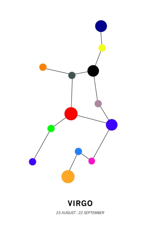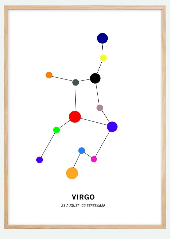En stjernetegnsplakat af horoskopet Jomfruen. Forskellige formede og farvede cirkler fylder den hvide baggrund, som hver især er forbundet med en lige linje for at skabe stjernebilledet Jomfruen. Datoerne for dette stjernetegn er anført under billedet for at minde dig om dem.