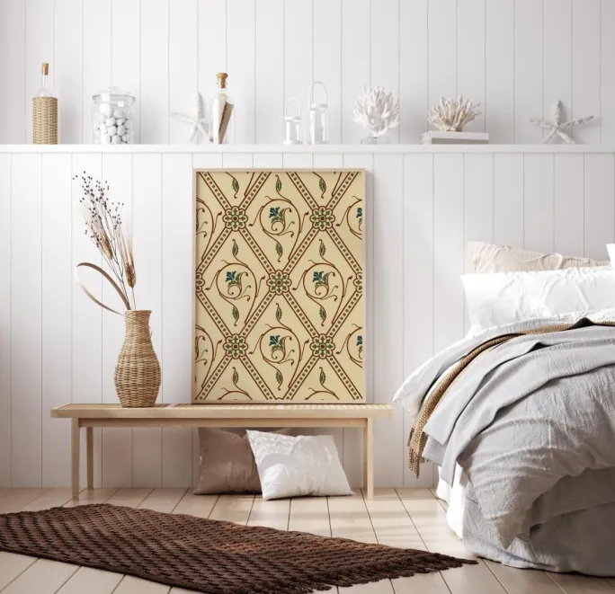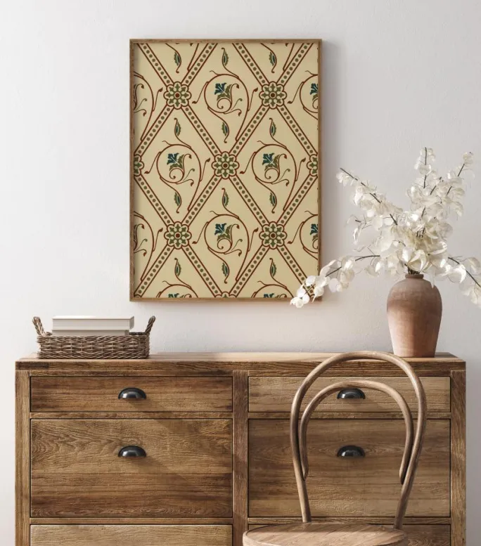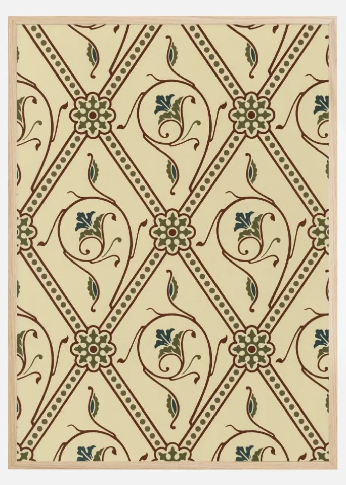 En tapetplakat med cremefarvede, røde og grønne mønstre. Store diamanter danner hovedgrænserne i mønstret. Inden for hver enkelt er der en række snoede røde linjer, der ender i grønne og blå blad- og blomsterformer. Mønstret er elegant og flydende og er den perfekte måde at pifte en almindelig væg op med noget lidt anderledes.
