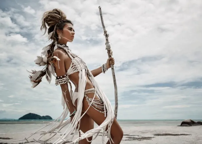 En krigerplakat af en ung kvinde, der poserer på en strand, klædt i lyst tribal-tøj. Hendes solbrune hud står i kontrast til de hvide, flydende klæder og smykker, der dækker hendes krop og snor sig gennem hendes hår. Hendes kraftfulde positur får ekstra vægt af den lange stang, som hun bærer i venstre hånd, mens hun stirrer mod sine fjender.