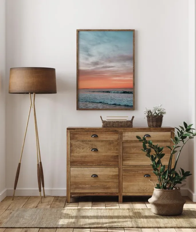 En lys plakat med bølger, der rammer stranden, mens solen går ned. Blide hvide krusede bølger ruller mod kysten under en klar aftenhimmel. Den orange solnedgang lyser i det fjerne og skaber en stemningsfuld aftenstemning, der er perfekt til et billede til at slappe af i slutningen af en lang dag.