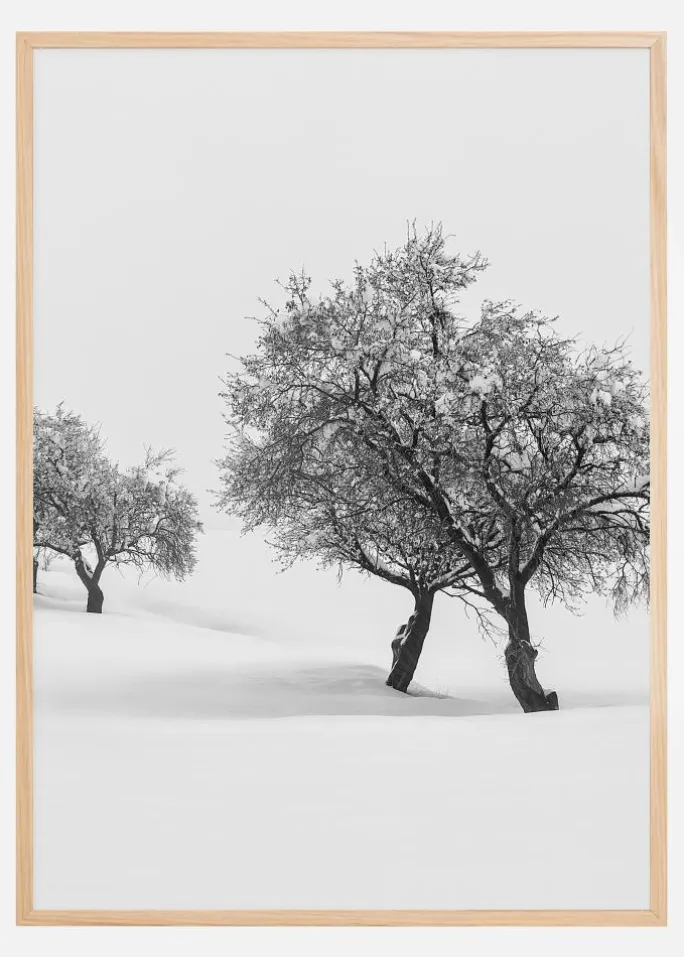 En snedækket plakat med træer, der bryder igennem et snedækket landskab. Den glatte hvide sne strækker sig så langt øjet kan se. De sorte stammer og grene skiller sig på en fantastisk måde ud mod den hvide sne og himmel. Få julestemning, når du sætter denne op derhjemme.