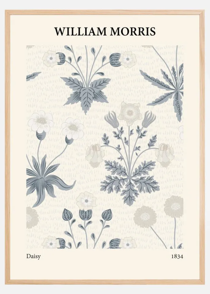 Denne herlige plakat inviterer beskueren ind i William Morris’ verden med mønsteret “Daisy” fra 1834. Det er et tidløst design, der fortryllende fanger essensen af naturens enkelhed gennem de lysblå margueritter og de yndefuldt placerede grønne blade. Hele kompositionen udstråler en fredfyldt harmoni, der er lige så aktuel nu som dengang.