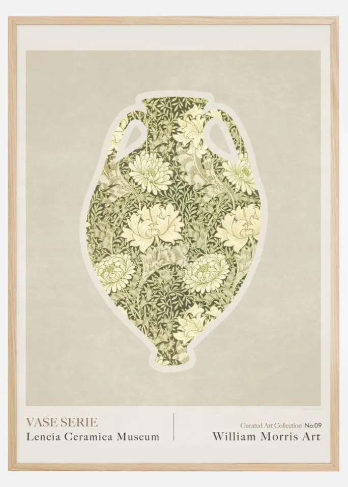 Med en farvepalet der består af jordnære grønne og cremefarvede nuancer, afspejler plakaten en dyb respekt for traditionelle kunstformer og håndværk. Motivet er omgivet af en lys træramme (ikke inkluderet i motivet), hvilket giver et moderne twist til det klassiske indhold og skaber en bro mellem fortiden og det nutidige. Denne plakat fra Lencia Ceramica Museum er nummereret som nr. 09 i serien, og er et udsøgt supplement til samlinger af både amatører og kendere, samt en fin detalje i ethvert hjem eller kontorrum der værdsætter design og historie.