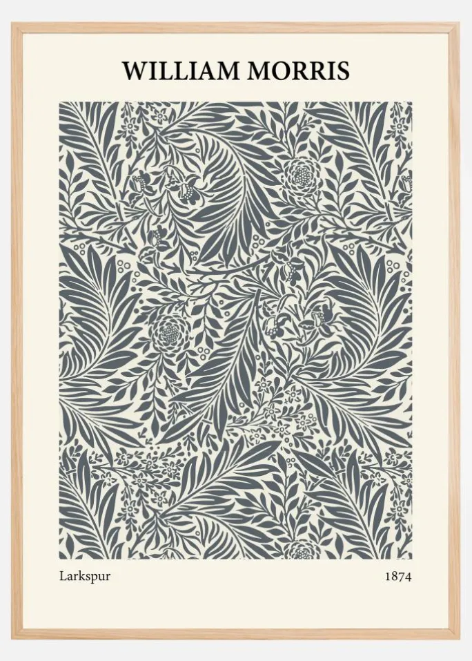 Denne William Morris-plakat fra 1874, betitlet “Larkspur”, fremhæver den udsøgte detaljerigdom og organiske skønhed, som er karakteristisk for Morris’ design. Motivet, der blomstrer med indviklede blomster og løv, udstråler en tidløs elegance, der komplementerer både traditionelle og nutidige rum. Designet er en klassisk repræsentation af Arts and Crafts-bevægelsens værdier, hvor håndlavet kvalitet og naturinspirerede temaer står i centrum.