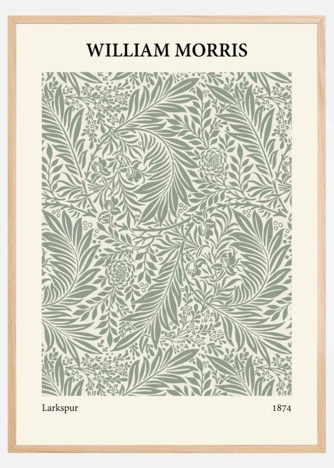 Denne William Morris-plakat, med titlen “Larkspur” fra år 1874, viser et hvirvlende hav af flora i et fortryllende og gennemarbejdet design. Hvert element i dette detaljerede mønster er omfattende sammenflettet, skaber en livlig og fængslende effekt. Denne print ville være en udsøgt detalje i ethvert hjem, der værdsætter kunsthåndværk og den naturnære æstetik fra Arts and Crafts-bevægelsen.