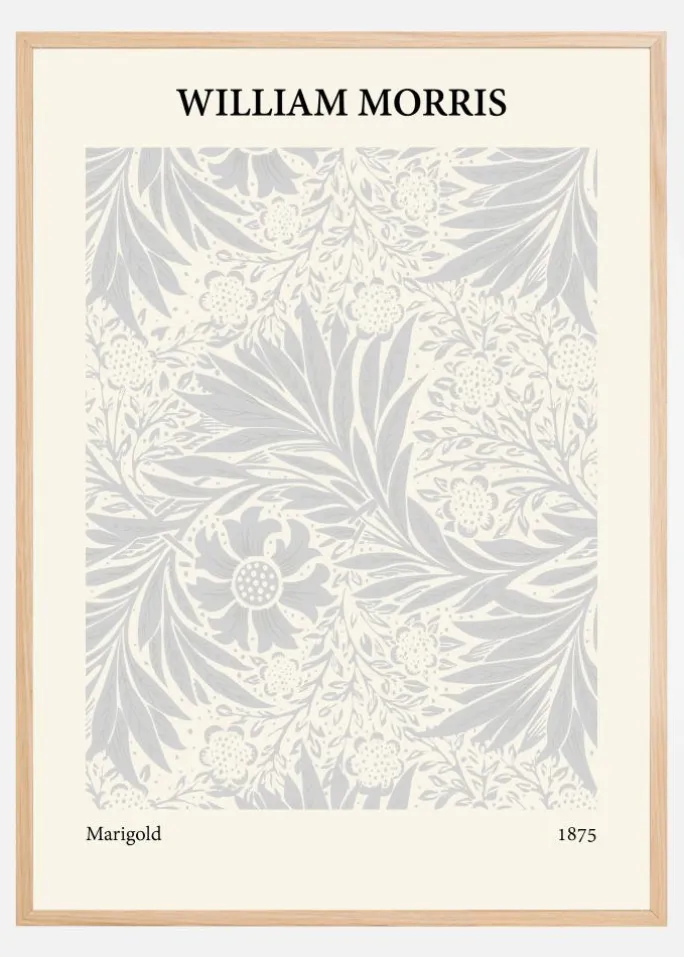 Denne plakat er en elegant gengivelse af William Morris’ “Marigold” fra 1875, og den fremkalder en følelse af ro og naturlig skønhed. Designet er fyldt med blomstrende morgenfruer og delikate bladeværk, omhyggeligt placeret i et symmetrisk og tiltalende mønster. Den subtile farvekombination af blege grå og hvide toner skaber en blød og indbydende æstetik, der er karakteristisk for Morris’ arbejde.