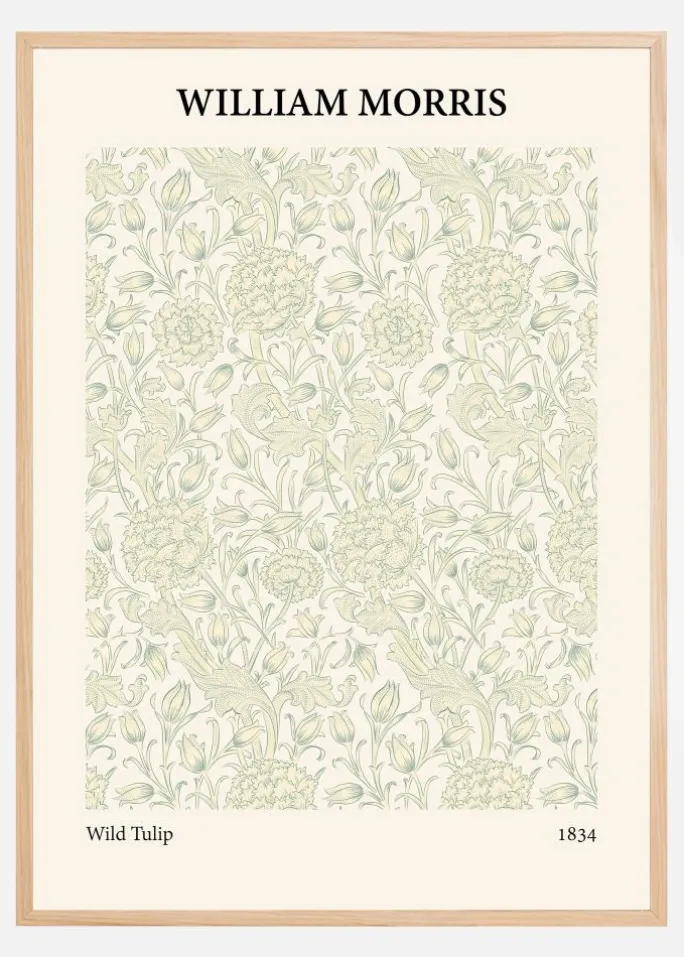 Denne William Morris-plakat, “Wild Tulip”, er en symfoni af vegetation, der fanger den naturlige verdens skønhed og elegance. Plakaten er udsmykket med et indviklet mønster af tulipaner og blade i en behagelig palet af grønne og blege guldfarver, som danser over en cremefarvet baggrund. Hver blomst og blad er formet med Morris’ sans for detaljer og komposition, hvilket giver en dyb og levende kvalitet til designet.