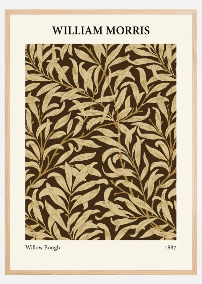 Denne dybt tiltalende plakat præsenterer William Morris’ “Willow Bough” mønster fra 1887 i en rig og jordnær farvepalet. Kontrasten mellem de livlige cremefarvede pileblade og den mørke baggrund skaber et dramatisk og samtidig sofistikeret indtryk. Denne design er en af de mest kendte fra Morris og viser hans evne til at kombinere skønhed og funktion i boligindretning.
