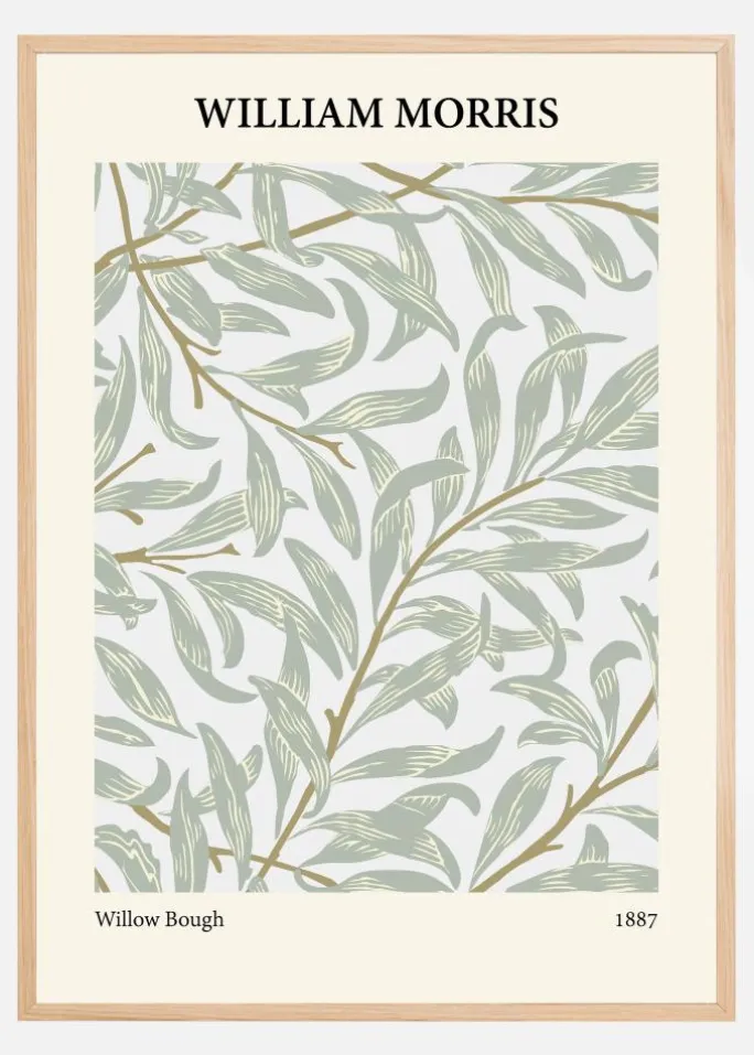 Denne lyse og friske plakat viser William Morris’ design “Willow Bough” fra 1887, kendetegnet ved slyngende grene og pileblade i et flydende og naturtro mønster. Den beroligende grønne farveskema fremhæver de detaljerede blade og giver en følelse af en stille have og en forbindelse til naturen, hvilket var centralt i Morris’ værk og i Arts and Crafts-bevægelsen som helhed.