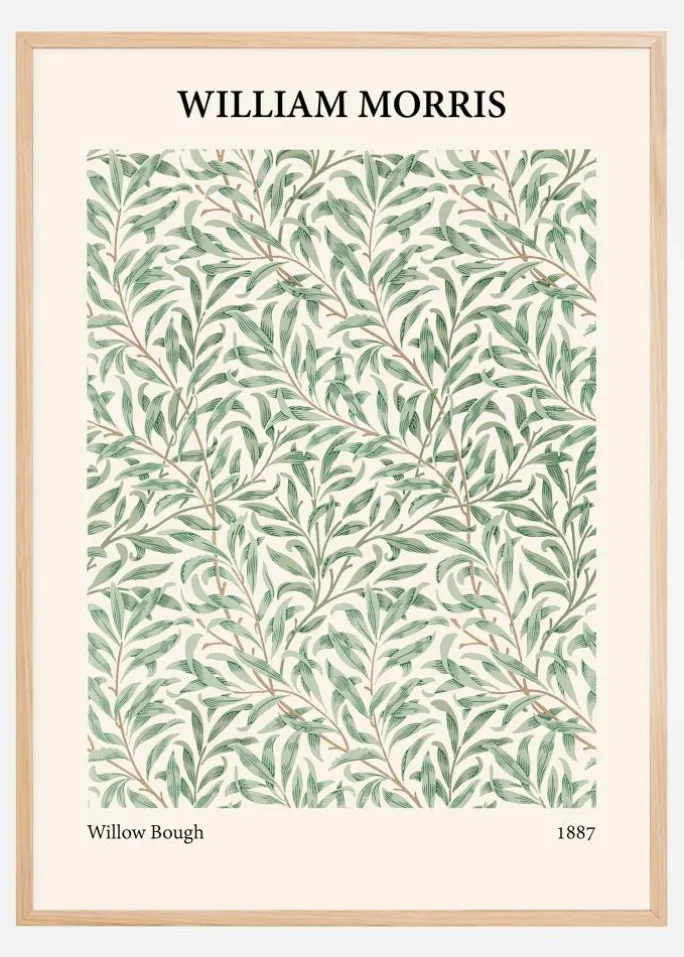 En mønstret plakat af et William Morris-tryk med pilebærbuske. De enkle grønne blade fylder printet, og hver enkelt er forbundet med tynde grene for at skabe et indviklet mønster i hele billedet. Tilføj dette til en pastelfarvet væg for at få noget lidt anderledes.