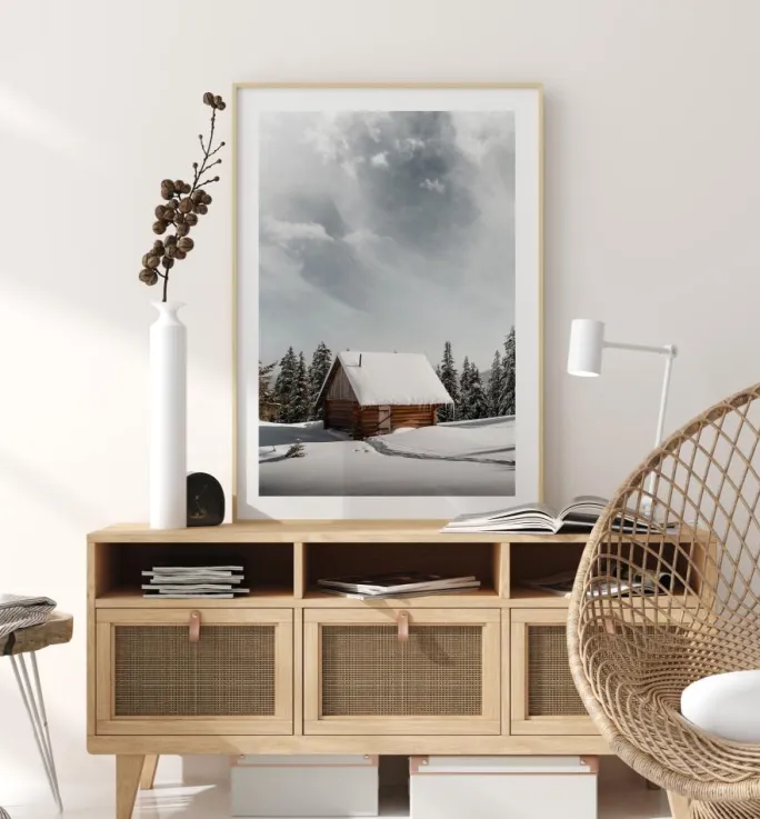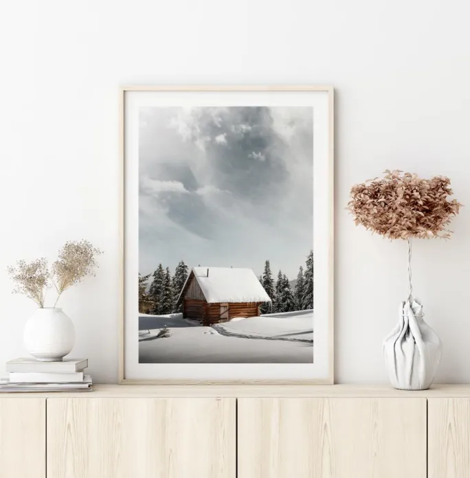 En juleplakat af en lille træhytte i et snedækket landskab. Blød sne dækker jorden og hyttens tag i dette vinterlige billede. Grantræer er dækket af sne, og mørkegrå sneskyer fylder himlen og er klar til at bringe mere sne. Mærk vinterkulden i dette elegante print.