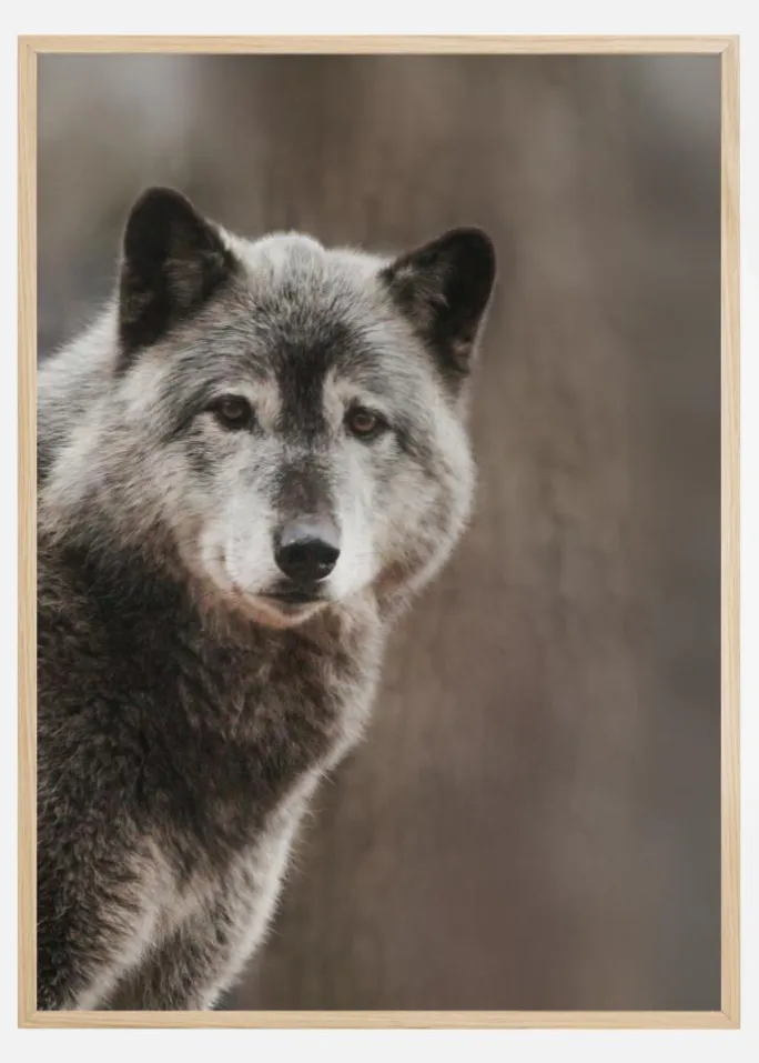 En plakat af en grå skovulv, der stirrer ud mod kameraet. Ulven har dog et blødt udtryk i ansigtet, der næsten ligner en hunds udtryk. Baggrunden er sløret og blød, men skaber en følelse af vildmarken og de forestående kolde årstider. Sæt dette billede på din væg, og kom tættere på naturen.