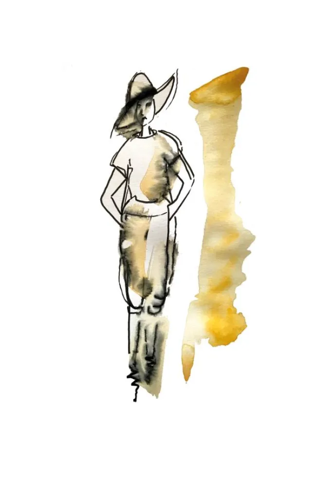 En kitsch abstrakt plakat af en kvinde, der står ved siden af en gul stribe. Kvinden er tegnet i en blækskitsestil og bærer en solhat. Bløde akvarelfarver fylder hende for at give hende farve. Ved siden af hende er der en stribe af lysegul maling i samme højde for en usædvanlig, malerisk tilføjelse til dette sjove lille portræt.