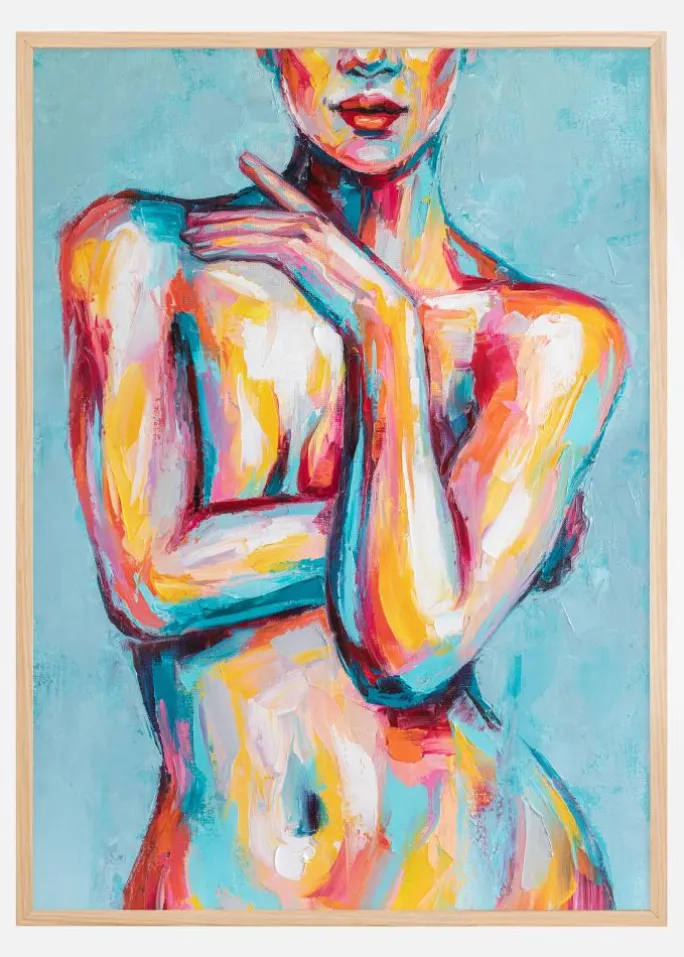 Denne unikke plakat fanger øjet med sin levende fortolkning af den kvindelige form gennem ekspressiv og farverig maling. Den abstrakte stil og de dristige penselstrøg sammensmelter en palet af varme toner såsom rød, orange og gul med kontrasterende kølighed fra blå og turkis, hvilket skaber en harmonisk balance i kompositionen. Hvid og sort bruger kunstneren dygtigt til at definere og fremhæve konturer og former, hvilket bidrager til at motivet vibrerer af liv og bevægelse. Denne plakat ville være en storslået og nutidig tilføjelse til ethvert rum, og fungerer som en samtalestarter og en kilde til daglig inspiration.