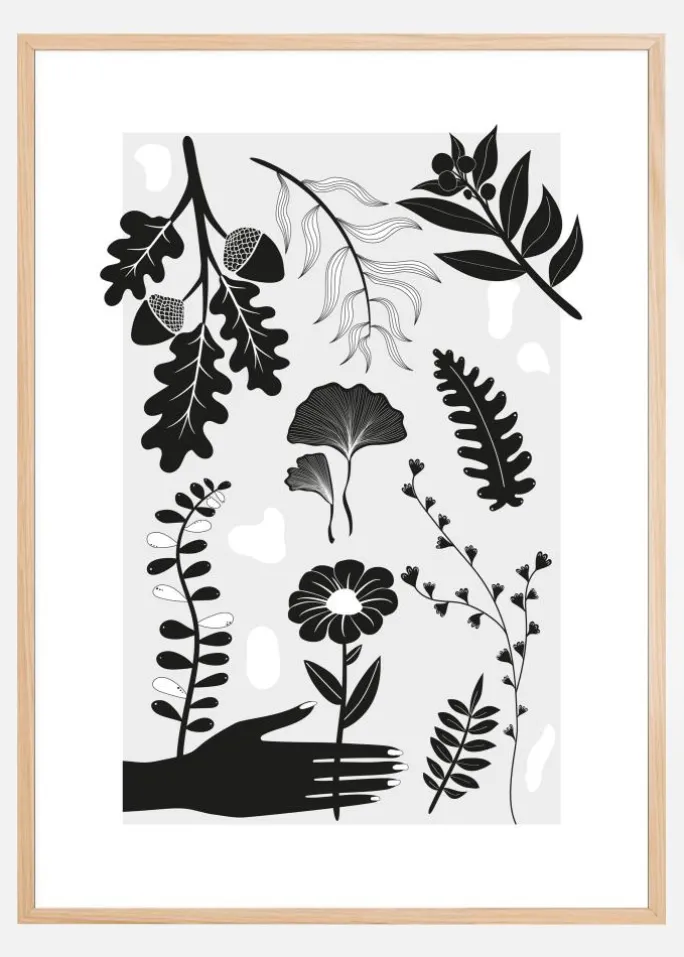 En fed plakat med sort/hvid printdesign af forskellige blade, planter og blomster. En sort hånd rækker ud for at gribe fat i en af de stiliserede blomster. Egern, blomster, bregner og meget andet fylder dette enkle, men interessante print. Kom i botanisk stemning, når du tilføjer denne planteplakat til dit hjem.