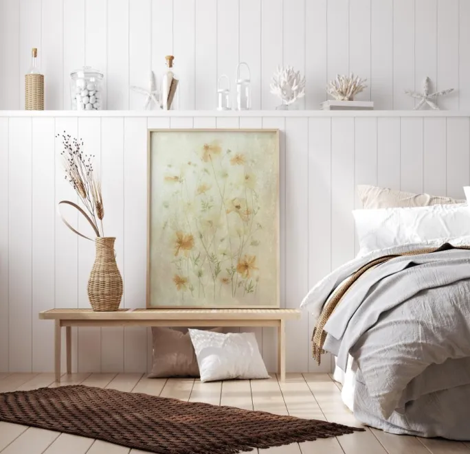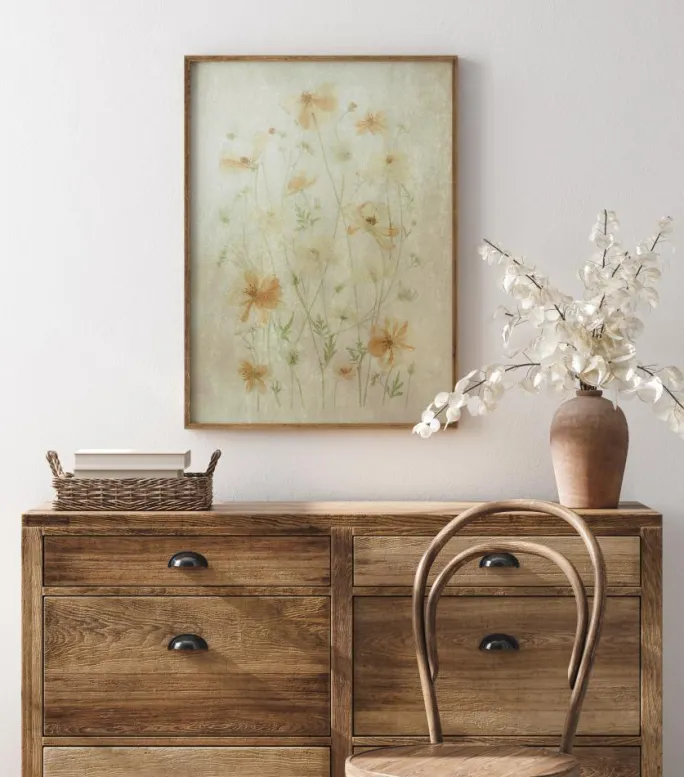 En elegant plakat med bløde orange blomster og grønne blade på en hvid baggrund. Akvareleffekten får hver af disse planter til at se bløde og delikate ud. Alligevel er der store detaljer i hver enkelt for dette bløde, blomstrede print. Gør dit hjem til en Edens have, når du tager dette Cosmos blomsterprint med hjem.