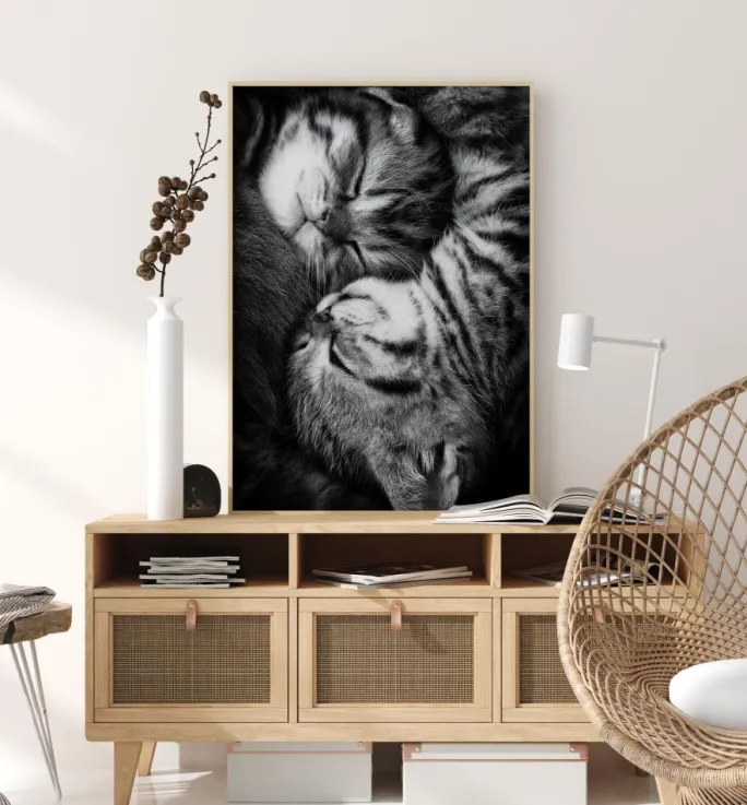 En sød dyreplakat med to kattekillinger, der ligger sammenkrøbet og sover. Tag dette print med hjem og nyd følelsen af et kram, når du ser på de nuttede katte, der ligger sammen.