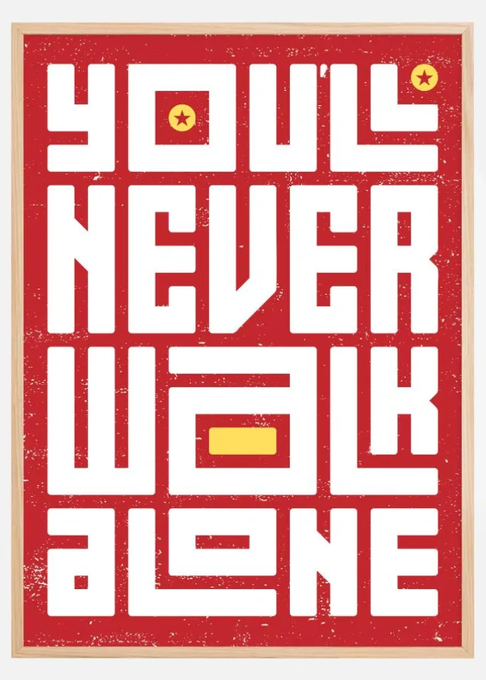 Denne energiske og opløftende plakat udstråler en stærk tilstedeværelse med sin dristige, blokagtige typografi, der fremhæver budskabet “You’ll Never Walk Alone” i skinnende hvide bogstaver mod en kraftfuld rød baggrund. De store bogstaver er omhyggeligt arrangeret for at maksimere deres visuelle effekt og er udsmykket med guldfarvede stjerner og en rektangulær form, der bryder tekstblokken, hvilket tilføjer en yderligere dimension til designet.