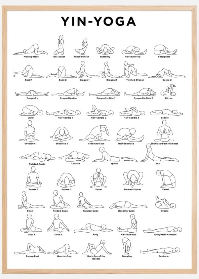 En sjov designplakat, der viser dig de forskellige yogastillinger, du kan lære. Den hvide plakat har hver figur tegnet med sort, siddende eller liggende i hver stilling, med navnet skrevet nedenunder. Hæng denne op hvor du kan se den i dit hjem og følg hver af poserne for at få strækket dig ordentligt.