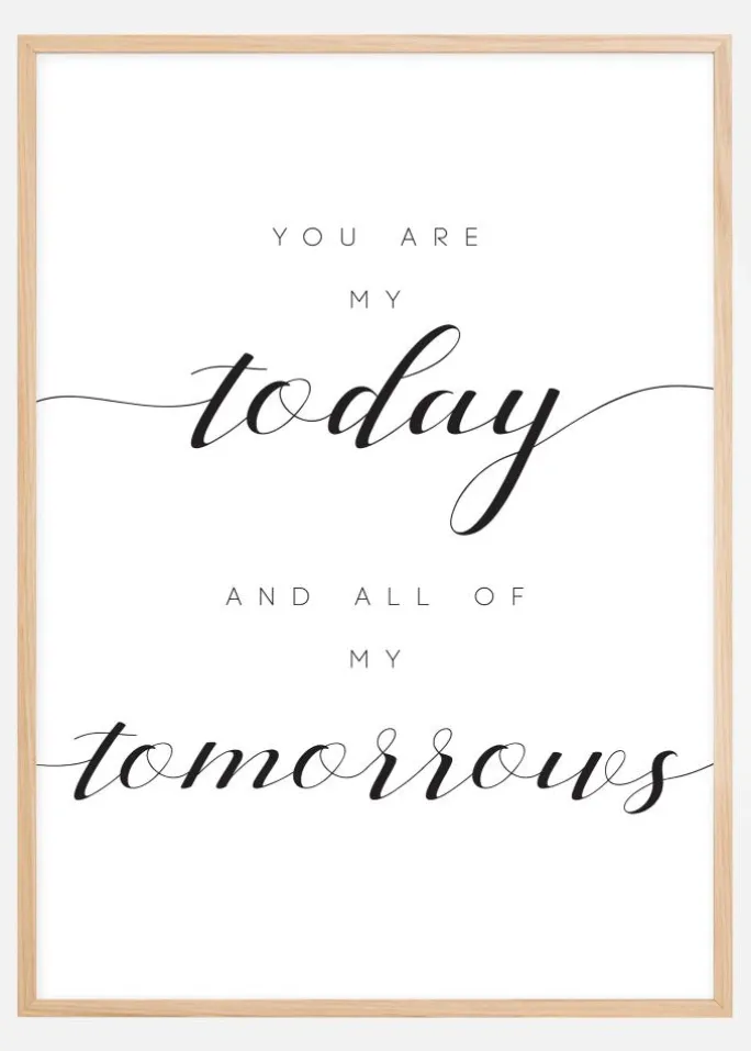 En motiverende plakat med et stærkt citat, der skal inspirere dig dagligt. You Are My Today and All of My Tomorrows er den perfekte gave til en elsket person for at vise dem, hvor meget du sætter pris på dem. Placer den et sted, hvor de kan se den hver morgen.
