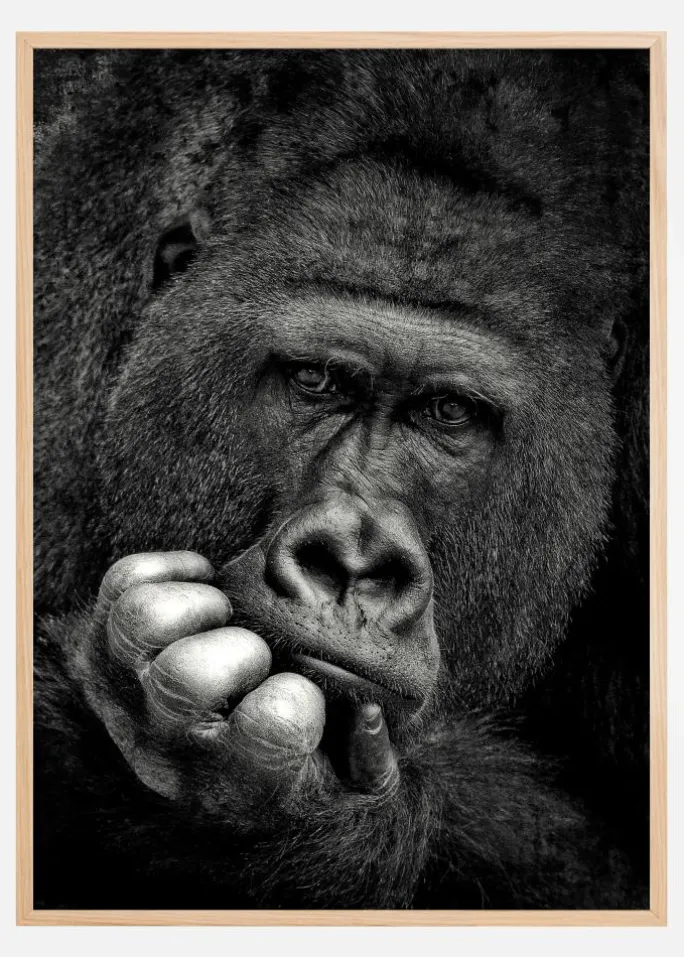 En fantastisk portrætplakat af en gorilla i en kontemplativ positur. Gorillaen stirrer med et ukoncentreret blik mod kameraet. Den ene hånd er krøllet under hagen, som om den overvejer vigtige spørgsmål. Det sort-hvide print fremhæver alle detaljerne i ansigtet på denne helt utrolige store abe.