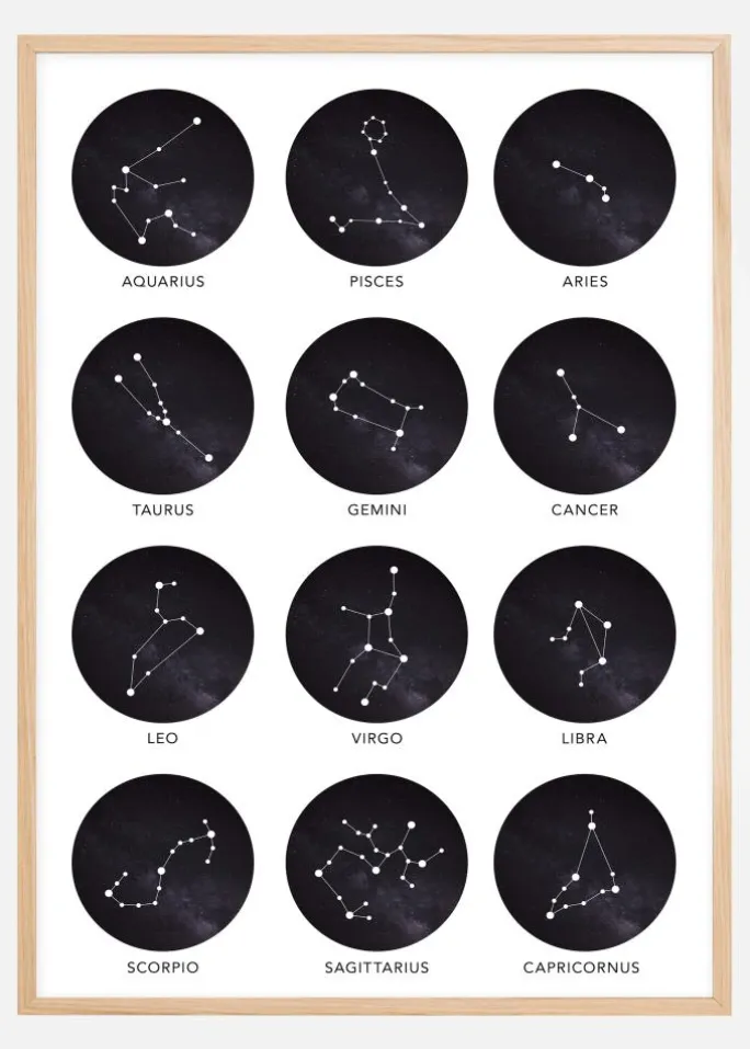 Giv en plakat med stjernetegn til en du holder af eller forkæl dig selv med noget fint. Denne stilfulde posters har motiver af alle stjernetegnene, og under motiverne står tegnenes navne på engelsk. Glem ikke at vælge en matchende ramme til din plakat!